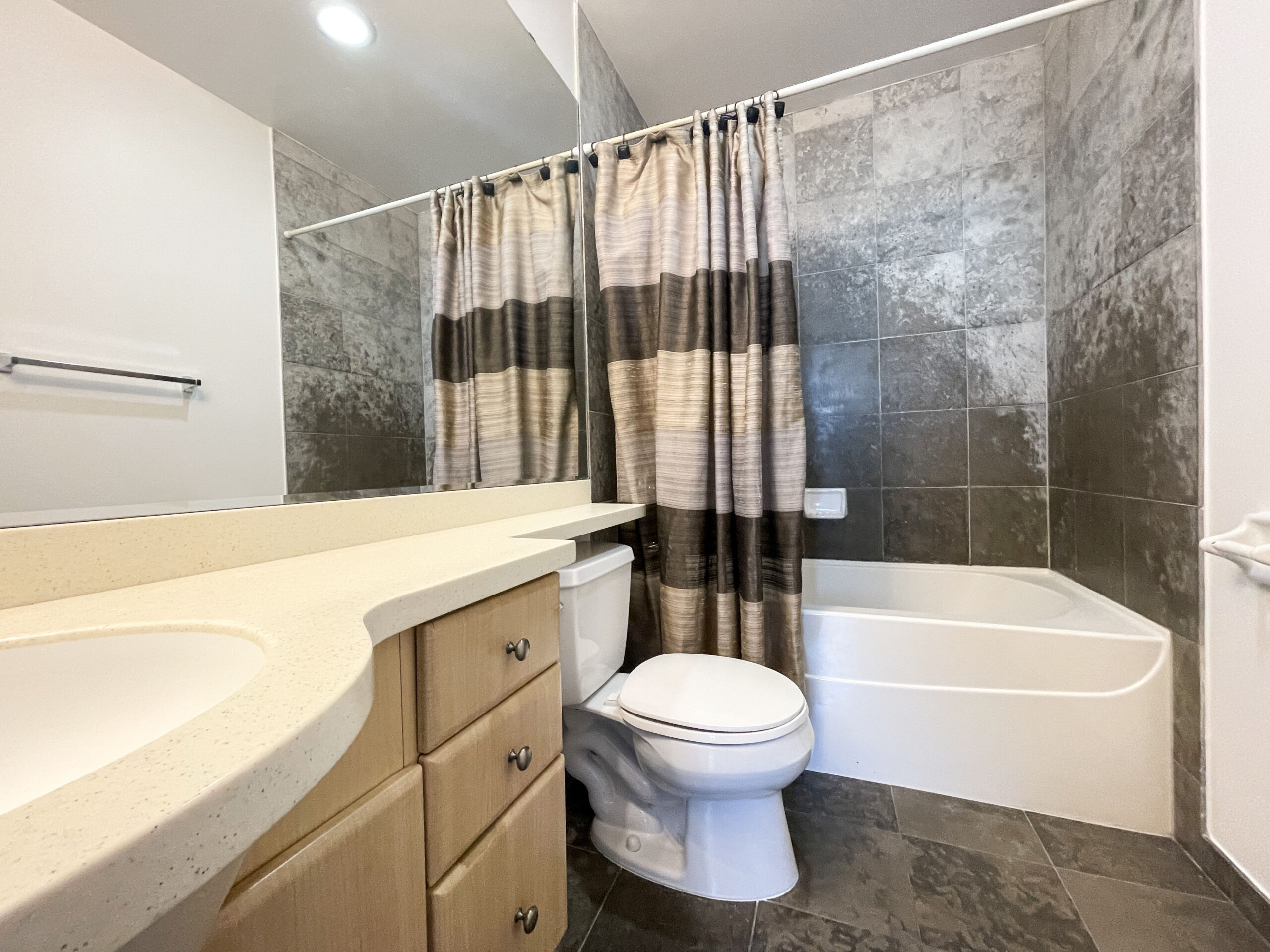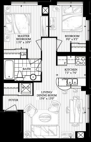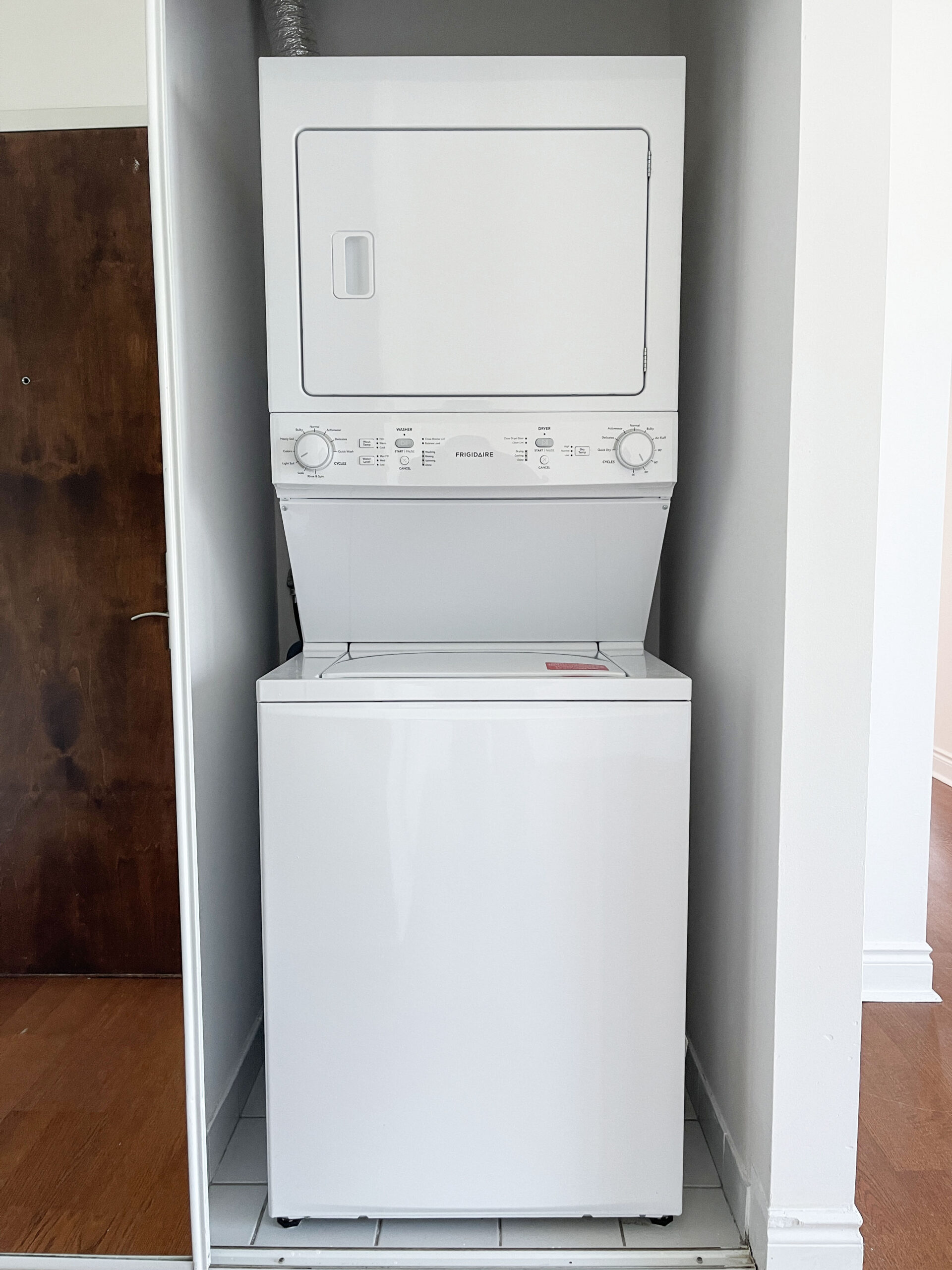 The unit is approximately 705 sq ft and features hardwood throughout, 6 appliances, washer/dryer included. Panoramic NORTH/WEST facing view. Granite counter-tops. ONE full bath. No balcony.