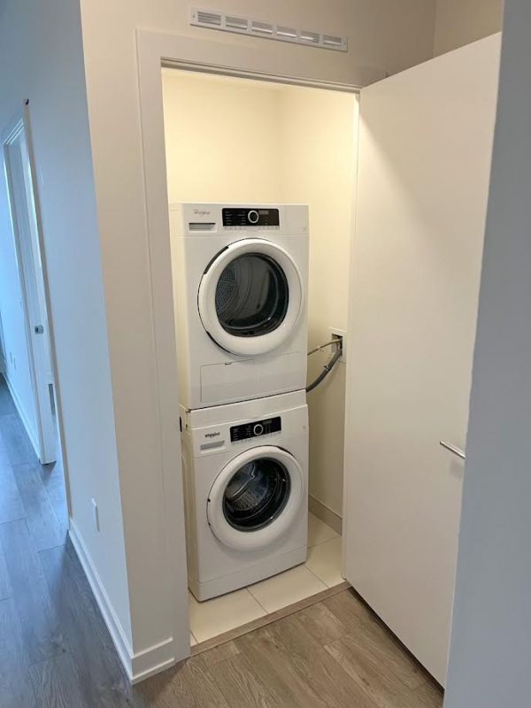 The unit is approximately 811 sq ft, fully upgraded, and comes with new stone kitchen counters, six stainless steel finished appliances, en-suite laundry, and laminate flooring throughout. The unit also includes a large, 148 sq ft balcony for the tenant’s private use. Two full bathrooms.