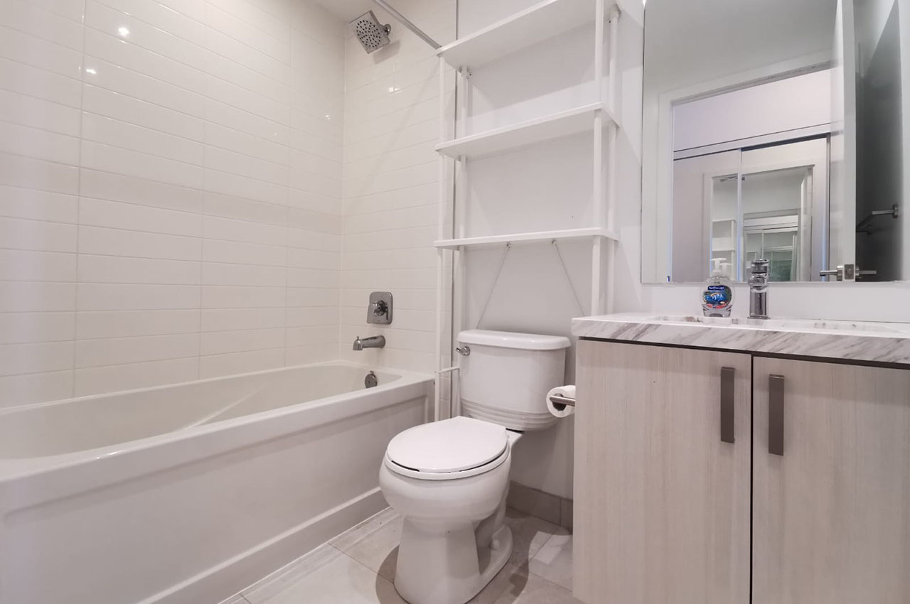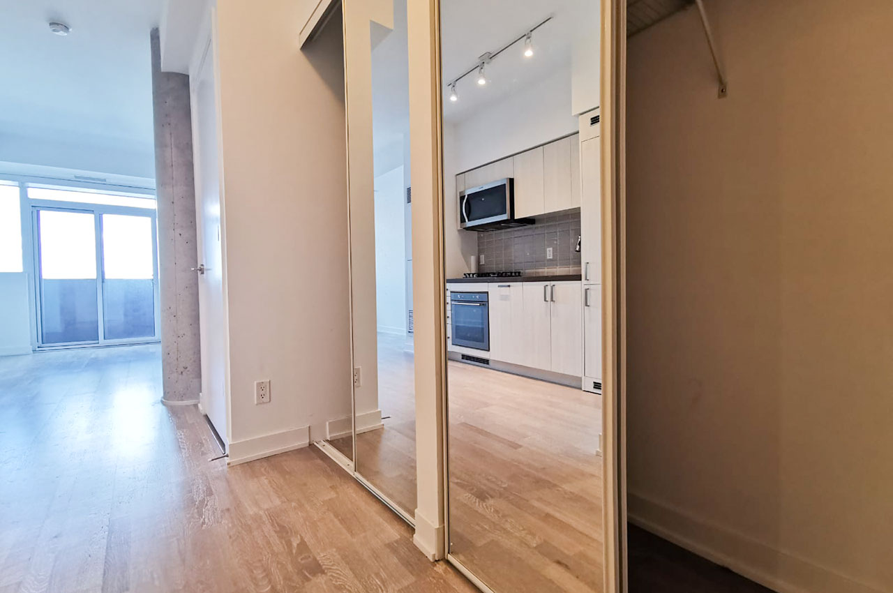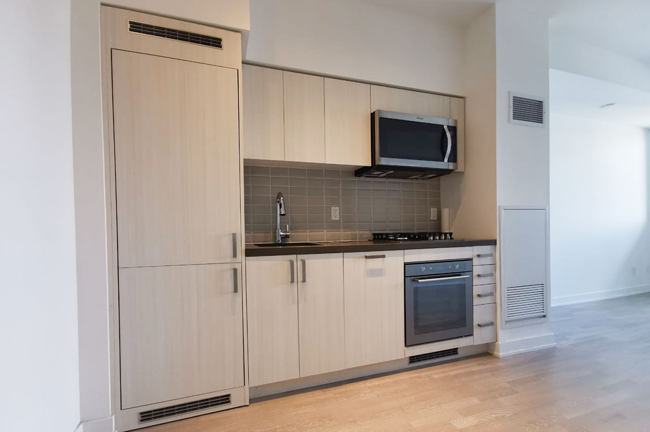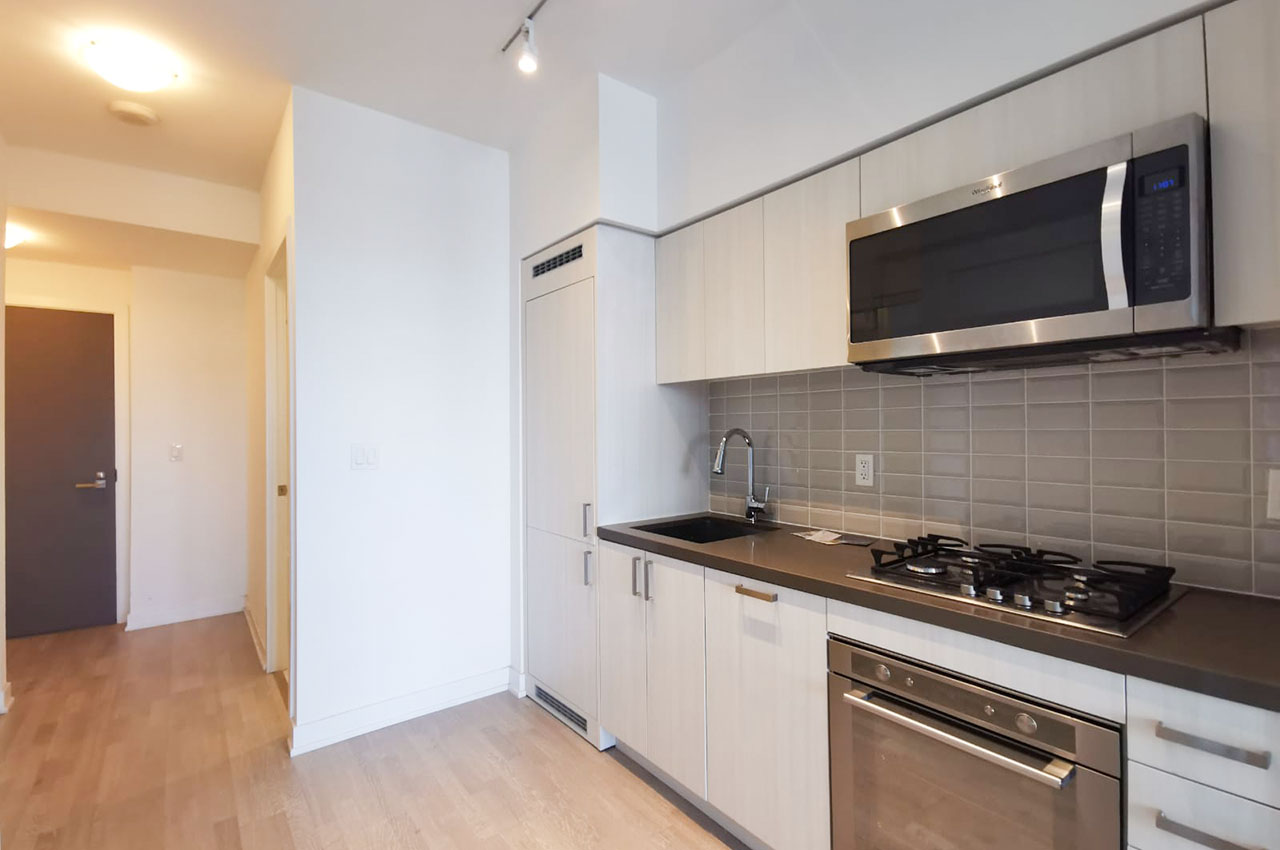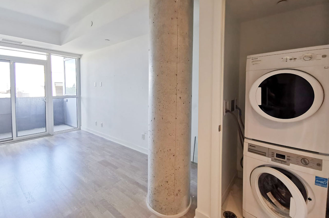 Approximately 382 sq ft + 39 sq ft balcony. The unit comes with high-end finishes, integrated appliances (including gas stove and inverter microwave), ensuite laundry and much more. 10 ft ceilings throughout. Lots of natural light. Balcony with an unobstructed West view. Located on the 3rd floor.