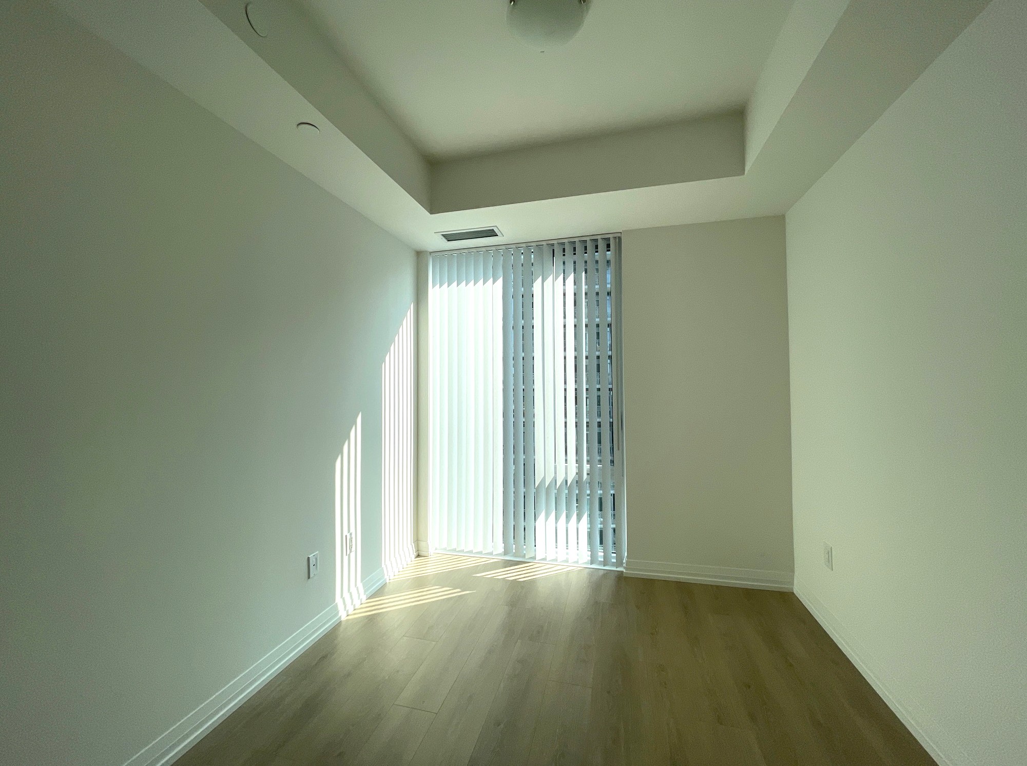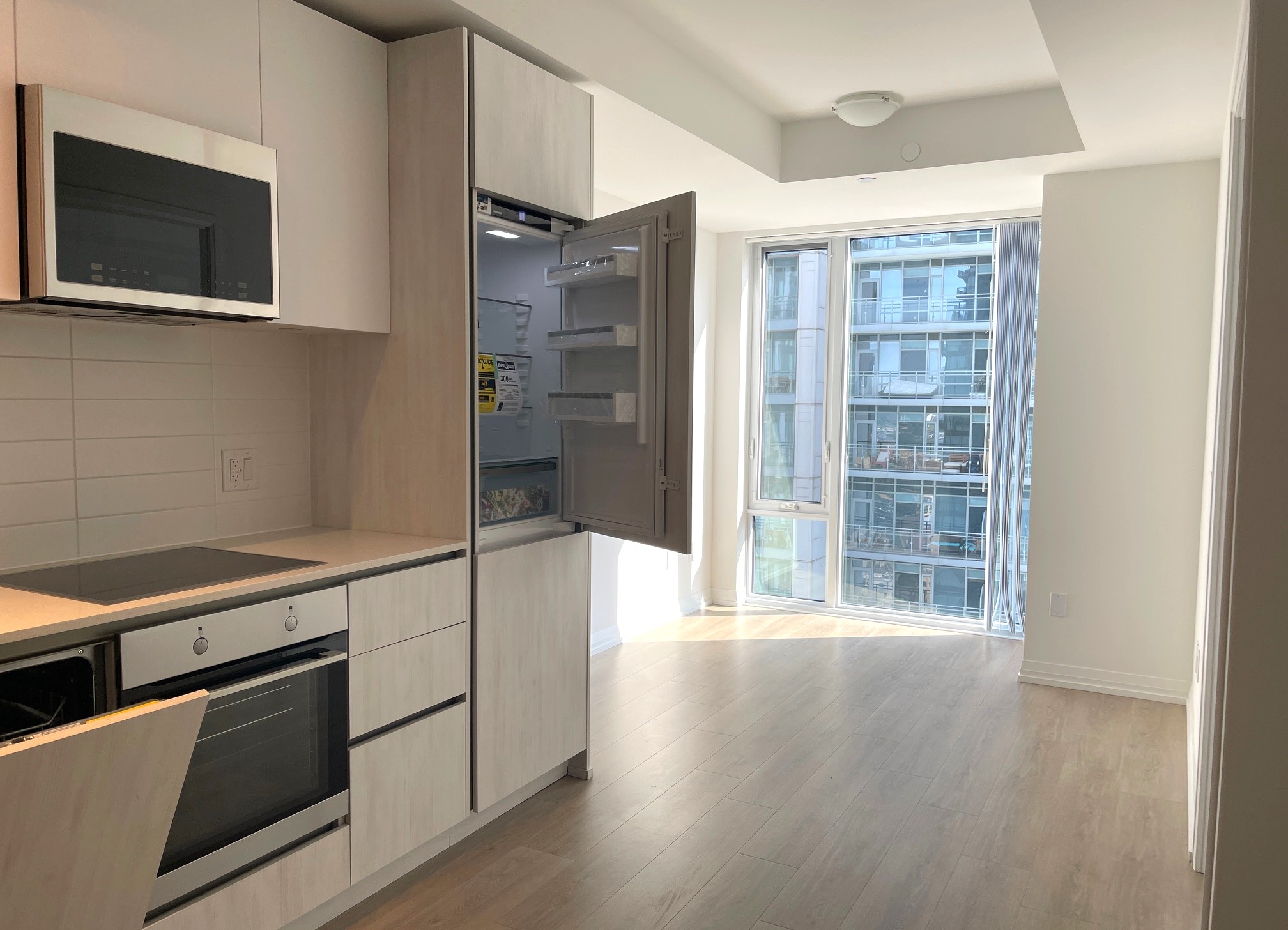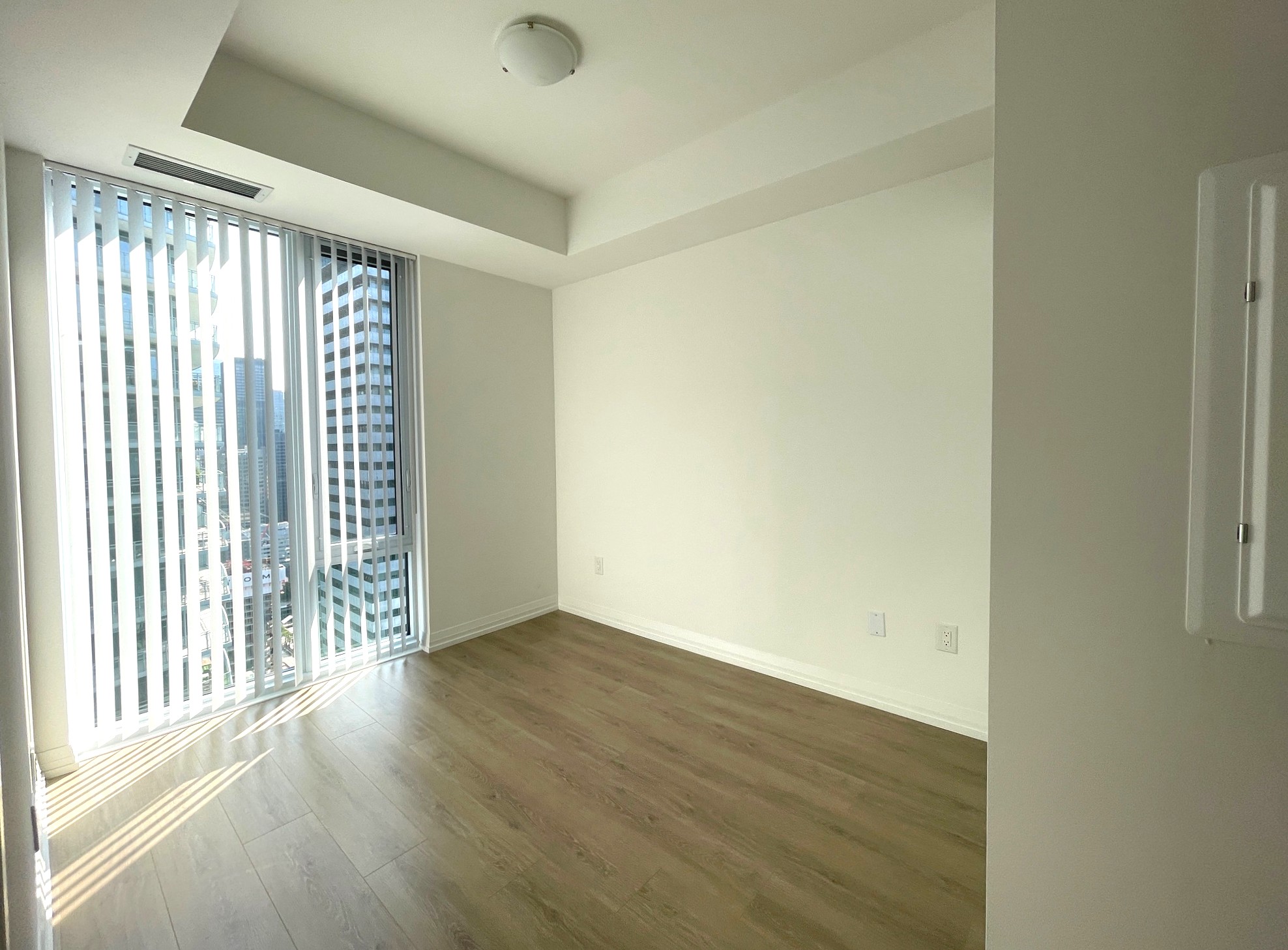 MODERN UNFURNISHED 1 BEDROOM + DEN CONDO IN THE HEART OF THE ENTERTAINMENT DISTRICT FOR RENT! Approximately 500 sq ft. The unit comes with high-end finishes, 6 appliances, blinds throughout and much more. Ensuite laundry is included. Very functional layout with designated living room space and bedroom area. Located on the 40th floor with a charming view of Downtown core. No balcony. East Facing.