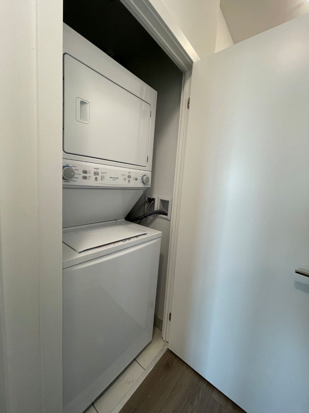 The unit is approximately 732 sq. ft and features a functional split layout, large windows, and modern finishes. Lots of natural light, modern roller blinds included. Laminated hardwood in common areas. Open balcony facing SOUTH. Located on the 7th floor. Six S/S appliances, including ensuite laundry. Two full bathrooms. Pets are permitted in accordance with building regulations. No smoking please.
