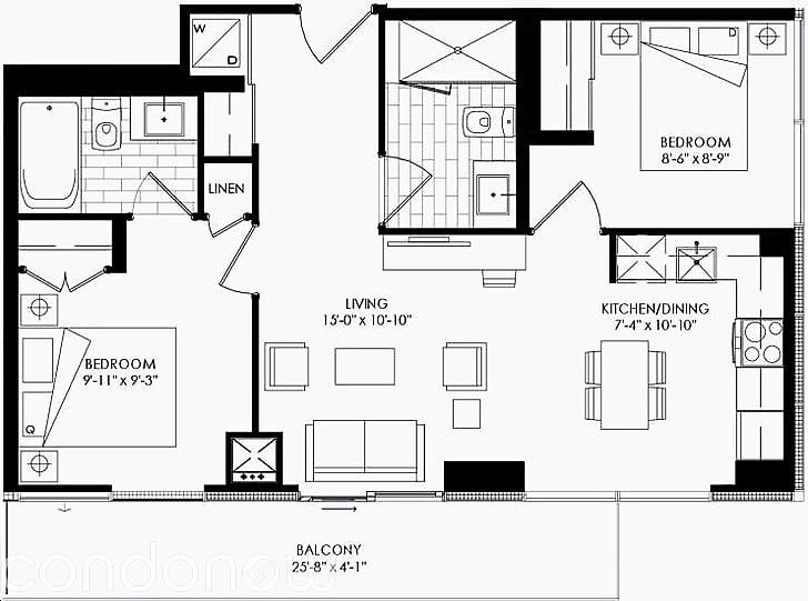 The unit is approximately 678 sq ft. Located on the 5th floor. S/S appliances incl. ensuite laundry. Ceramic back splash, granite countertops, large open balcony. TWO full bathrooms. Modern roller blinds included. No Microwave.